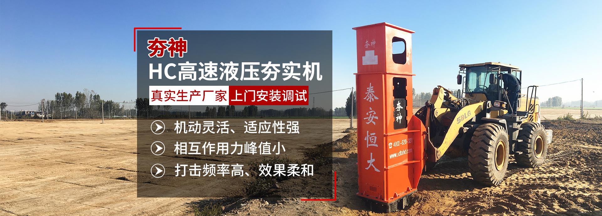 恒大機械租賃廠家主營產品:高速液壓夯實機,高速液壓打夯機,挖掘機液壓夯,裝載機液壓夯,液壓銑挖機,液壓打樁錘等產品,搭載安裝在3噸-70噸挖掘機
